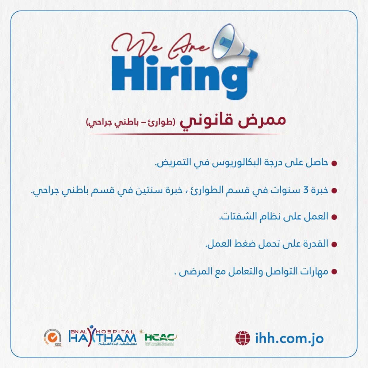 وظائف ممرض قانوني – مستشفى ابن الهيثم عمان 2025