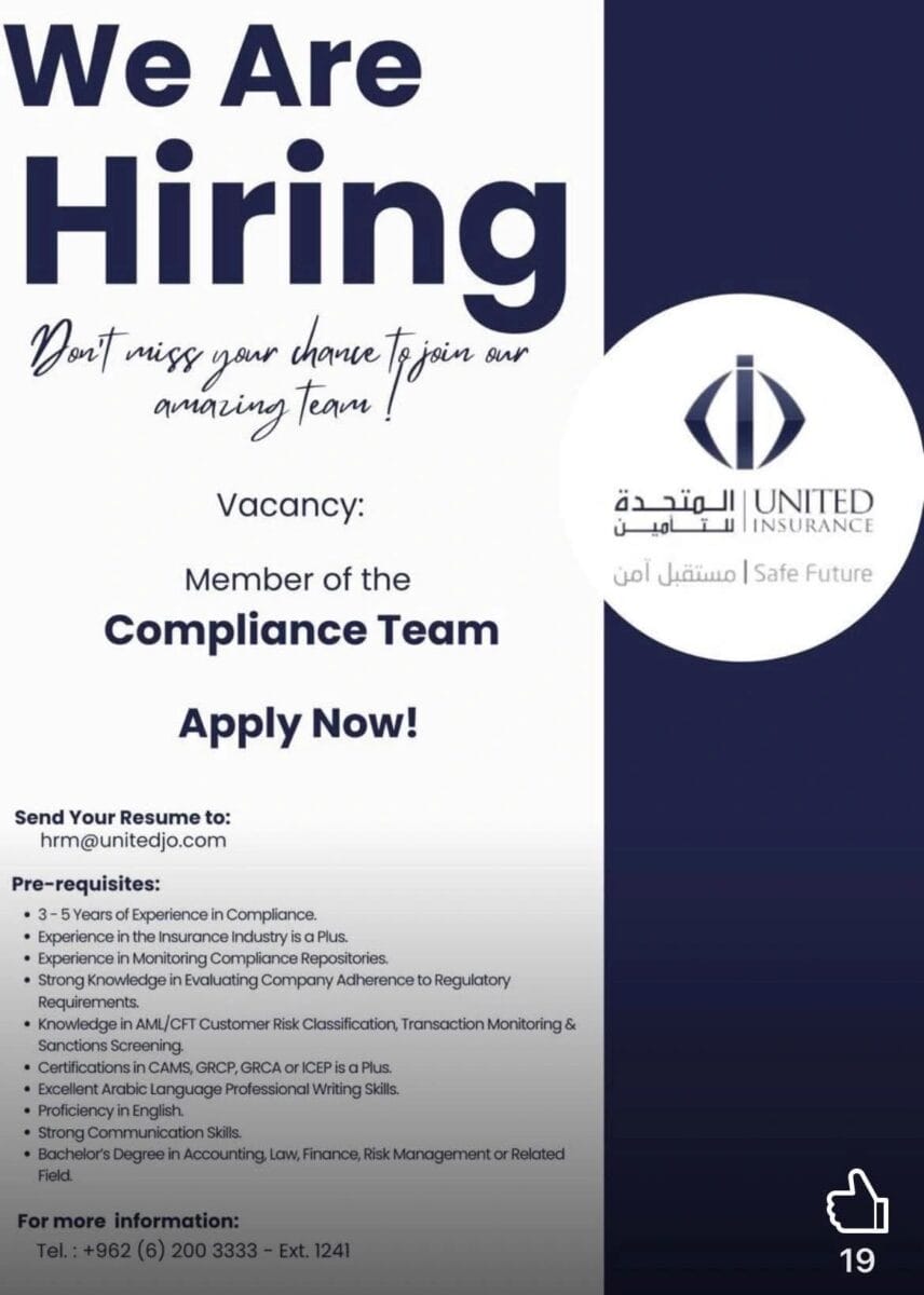 تعلن شركة المتحدة للتأمين عن توفر شاغر وظيفي لضم عضو جديد إلى فريق الالتزام (Compliance Team)، ضمن بيئة عمل مهنية تهدف إلى ضمان الالتزام بالمعايير التنظيمية وتحقيق أعلى مستويات الحوكمة.
