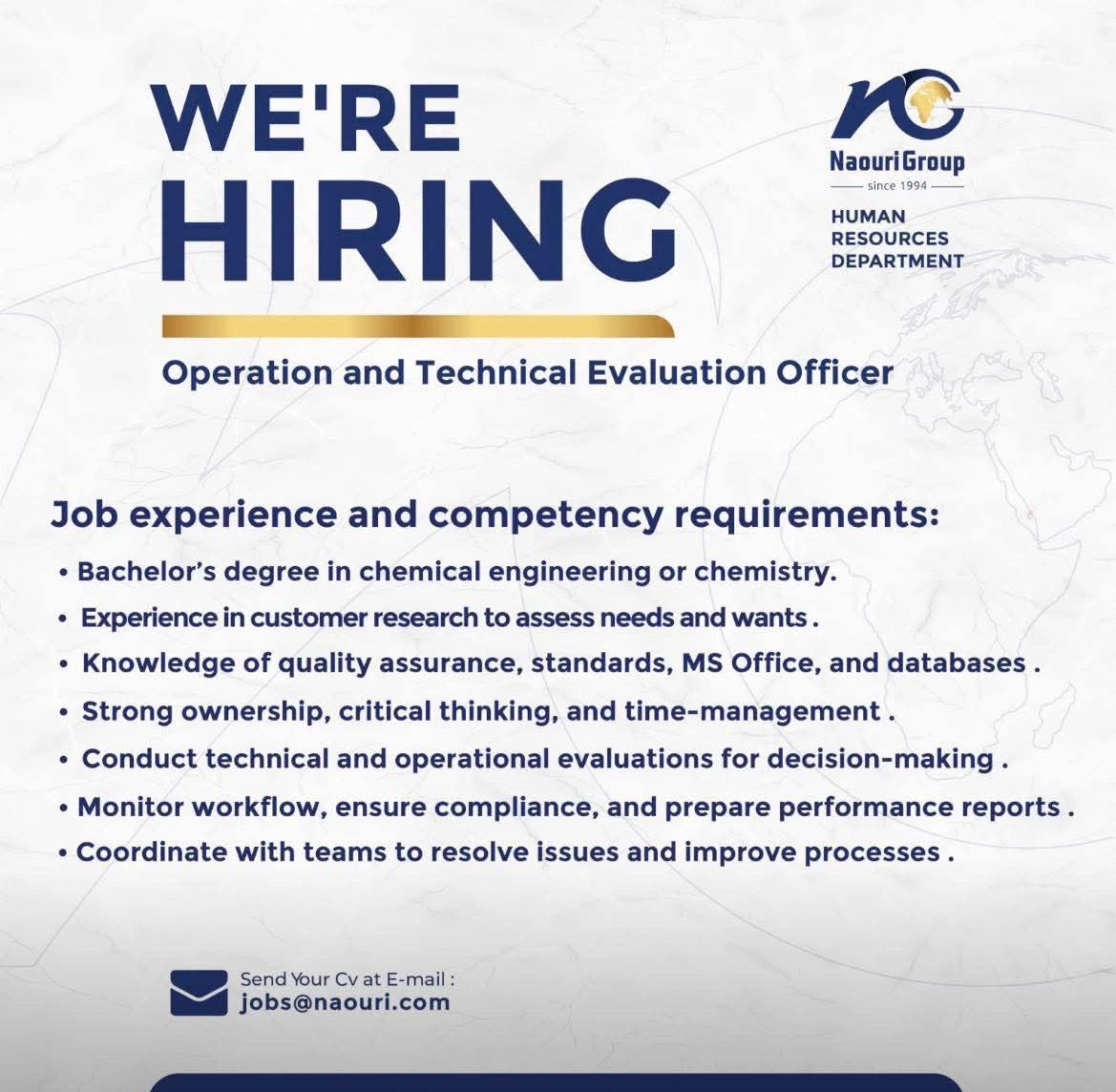 نحن في Naouri Group نعلن عن فرصة مميزة للانضمام إلى فريقنا بوظيفة Operation and Technical Evaluation Officer. إذا كنت تمتلك الخبرة العلمية والعملية في مجال الهندسة أو الكيمياء وتبحث عن بيئة مهنية تدعم التطور وتعزز الإبداع، فهذه فرصتك المناسبة.