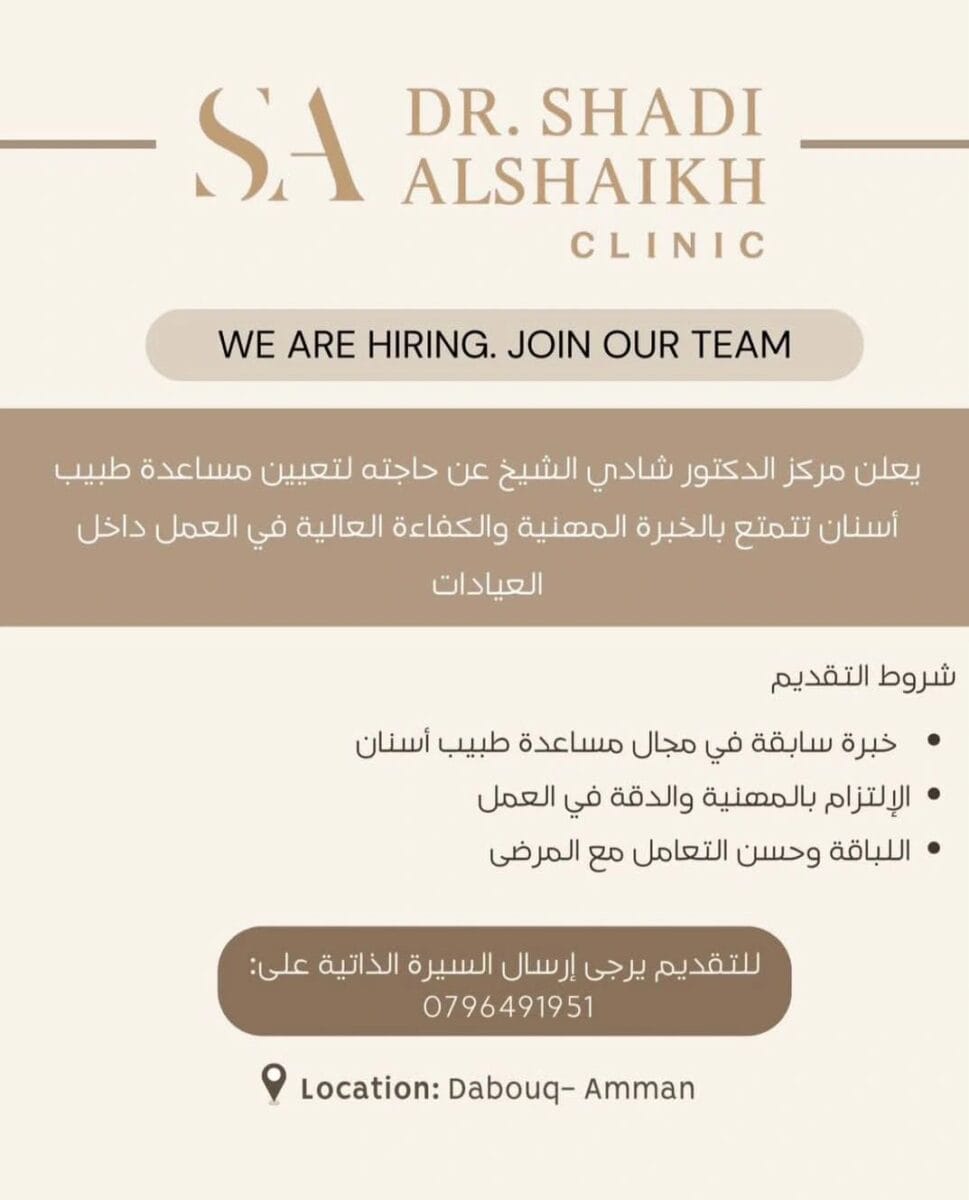 إذا كنتِ تمتلكين مهارات التعامل مع المرضى وتبحثين عن بيئة عمل راقية ومحترفة في دابوق – عمّان، فهذه فرصتك للانضمام إلى فريق طبي متميز.