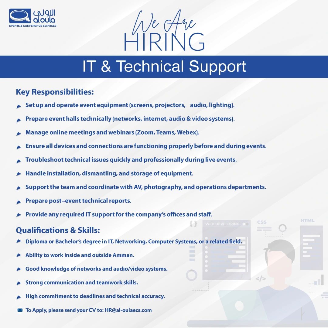 تُعد وظائف الـ IT والدعم الفني في عمان من أكثر الوظائف طلبًا، وتبحث العديد من الشركات عن محترفين قادرين على تشغيل الأنظمة التقنية وضمان نجاح الفعاليات والاجتماعات الرقمية. لذلك، تقدم هذه الفرصة بيئة مميزة للنمو المهني ضمن فريق متخصص.