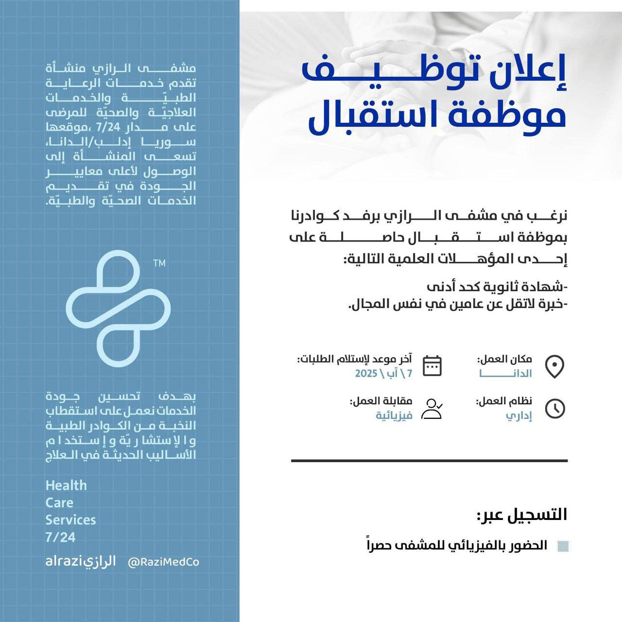 📢 مشفى الرازي – الدانا يعلن عن توفر شواغر للتوظيف في الوظائف التالية: