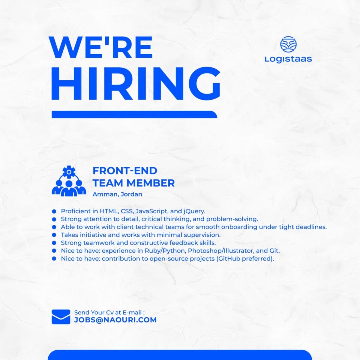تعلن Logistaas عن فتح باب التقديم لوظيفة Front-End Team Member للعمل في عمّان، ضمن فريق ديناميكي يقدّر الإبداع ويمنح مساحة للتطوير المهني.