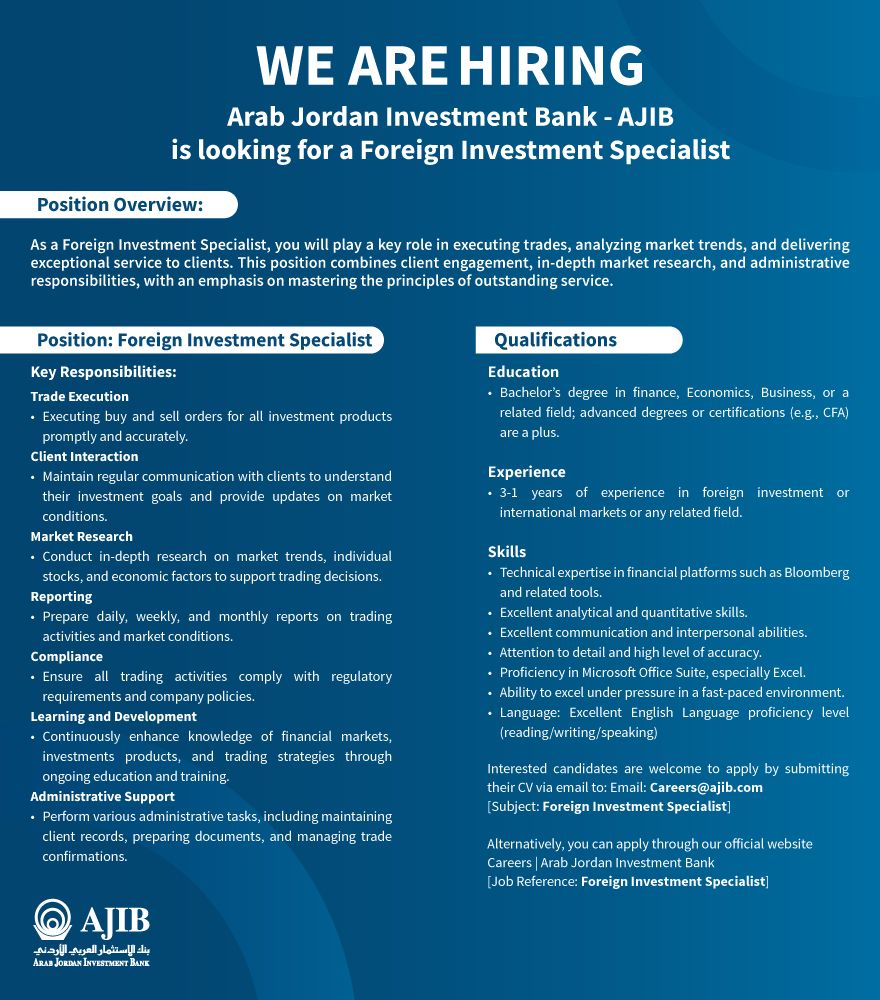 يعلن بنك الاستثمار العربي الأردني – AJIB عن فتح باب التقديم لشاغر أخصائي استثمار أجنبي (Foreign Investment Specialist)، للعمل ضمن فريق مختص في تنفيذ الصفقات، تحليل الأسواق، وخدمة العملاء باحترافية عالية.