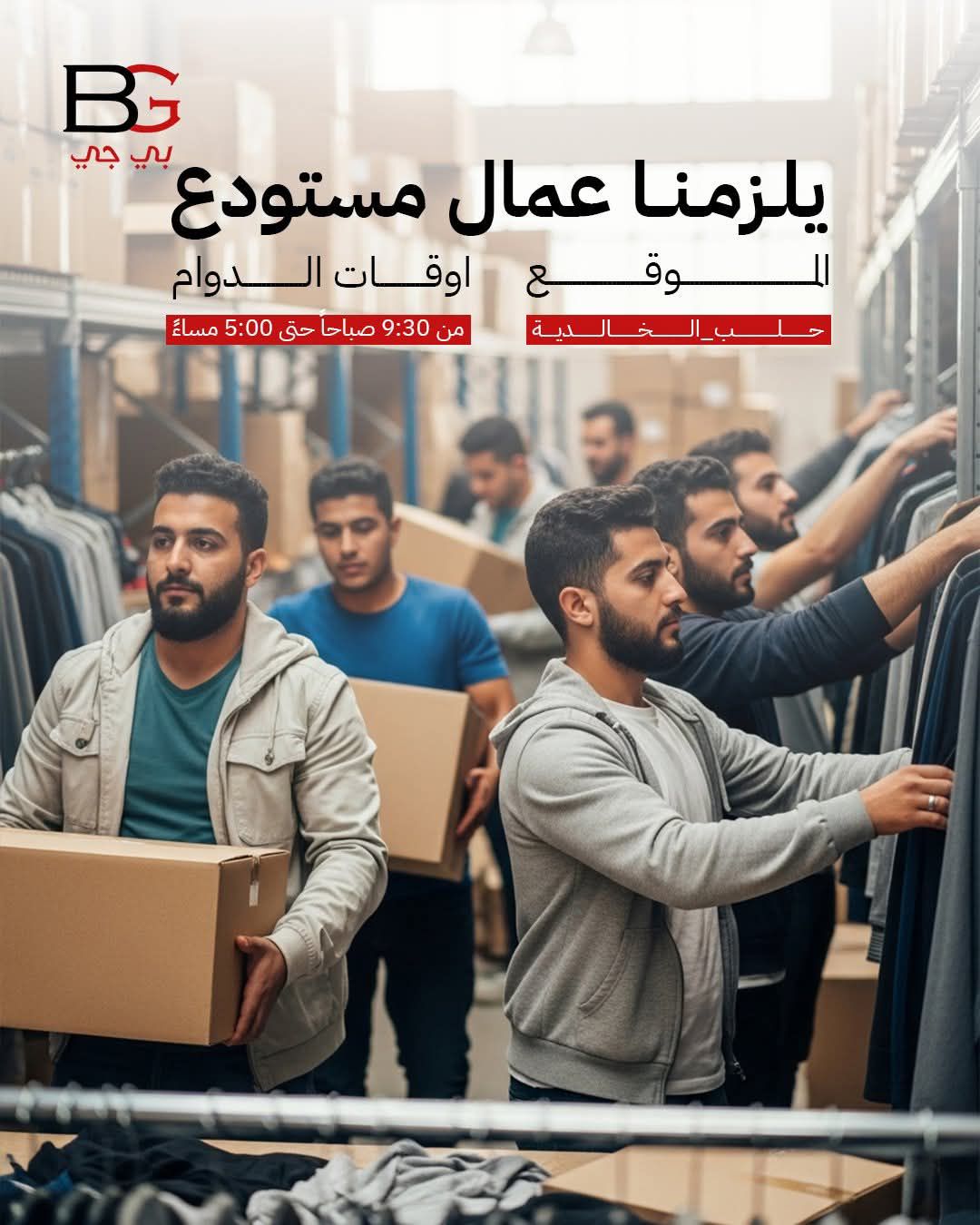 تُعلن شركة BG عن توفر شواغر وظيفية لعمال مستودع في فرعها بمنطقة الخالدية – حلب.
