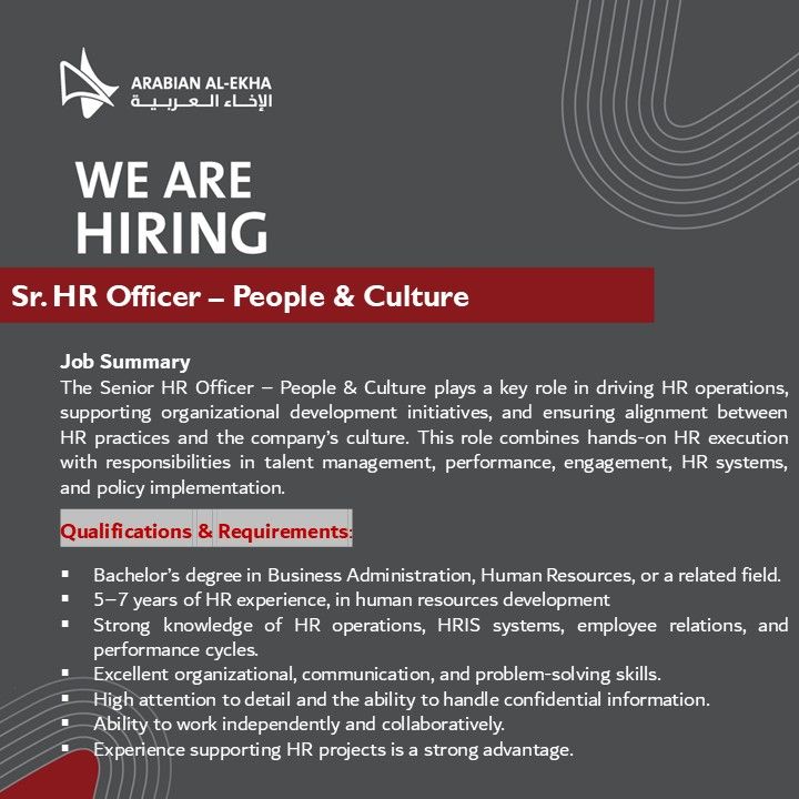 وظائف HR 2025 | مطلوب Sr. HR Officer – People & Culture في شركة رائدة