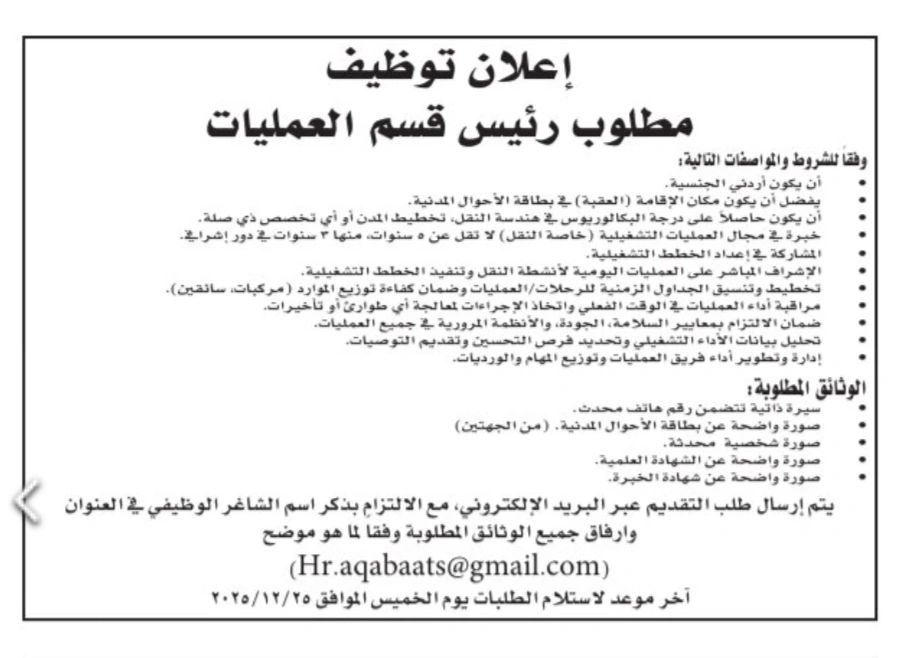 خبرة لا تقل عن 5 سنوات في العمليات التشغيلية (منها 3 سنوات بدور إشرافي).