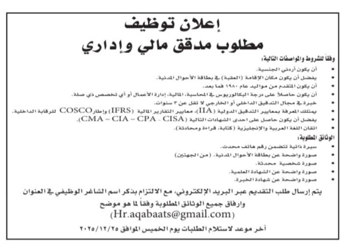 تعلن جهة رائدة في مدينة العقبة عن فتح باب التوظيف لشغل وظيفة مدقق مالي وإداري، وذلك ضمن شروط ومواصفات مهنية دقيقة تستهدف الكفاءات المؤهلة وأصحاب الخبرة في مجال التدقيق والمحاسبة.