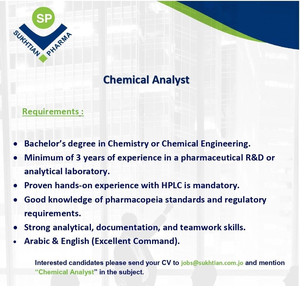 تعلن شركة سُختيان للأدوية عن حاجتها لتعيين محلل كيميائي للانضمام إلى فريق العمل في المختبرات التحليلية.