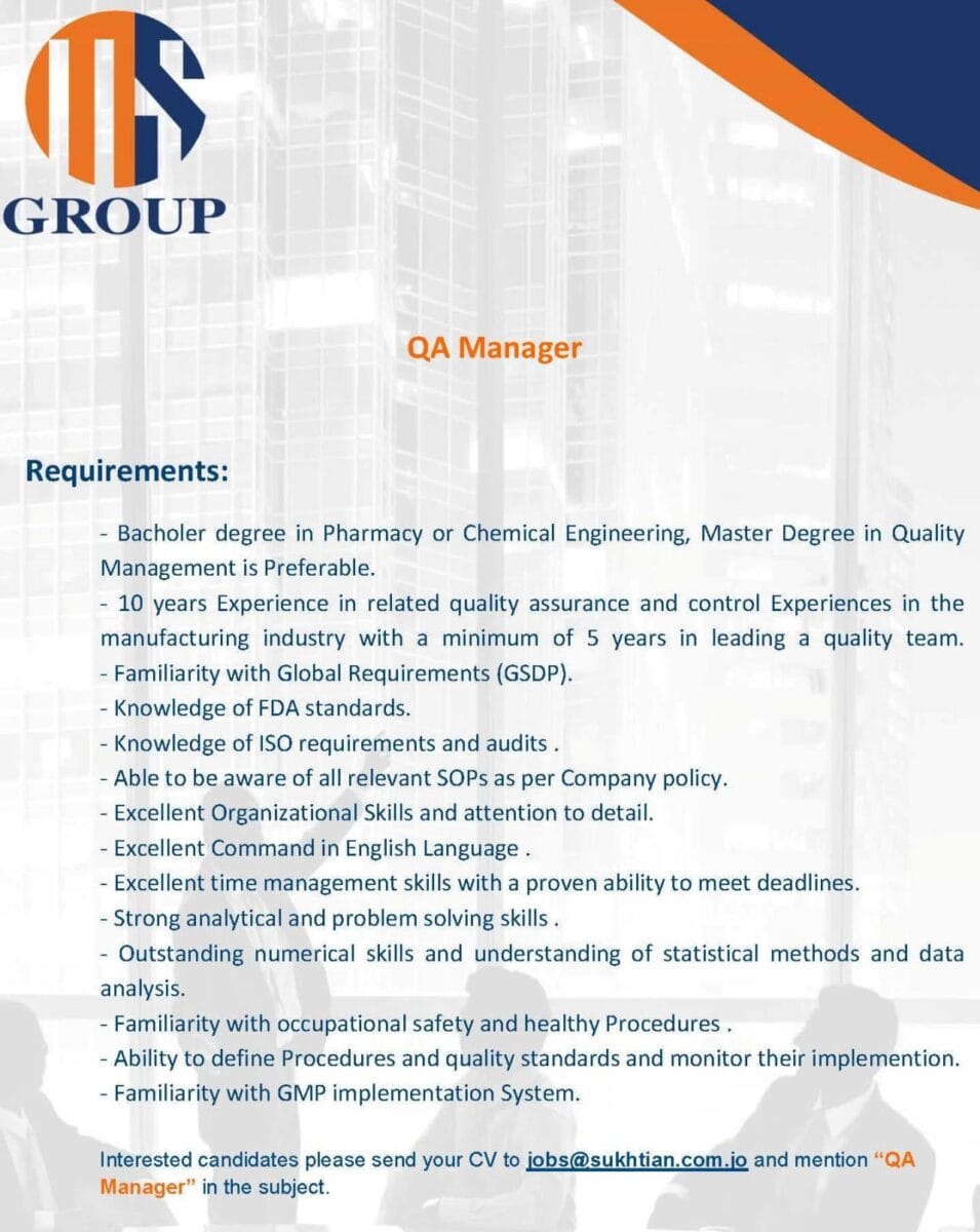 بكالوريوس في الصيدلة أو الهندسة الكيميائية (الماجستير في إدارة الجودة ميزة إضافية).