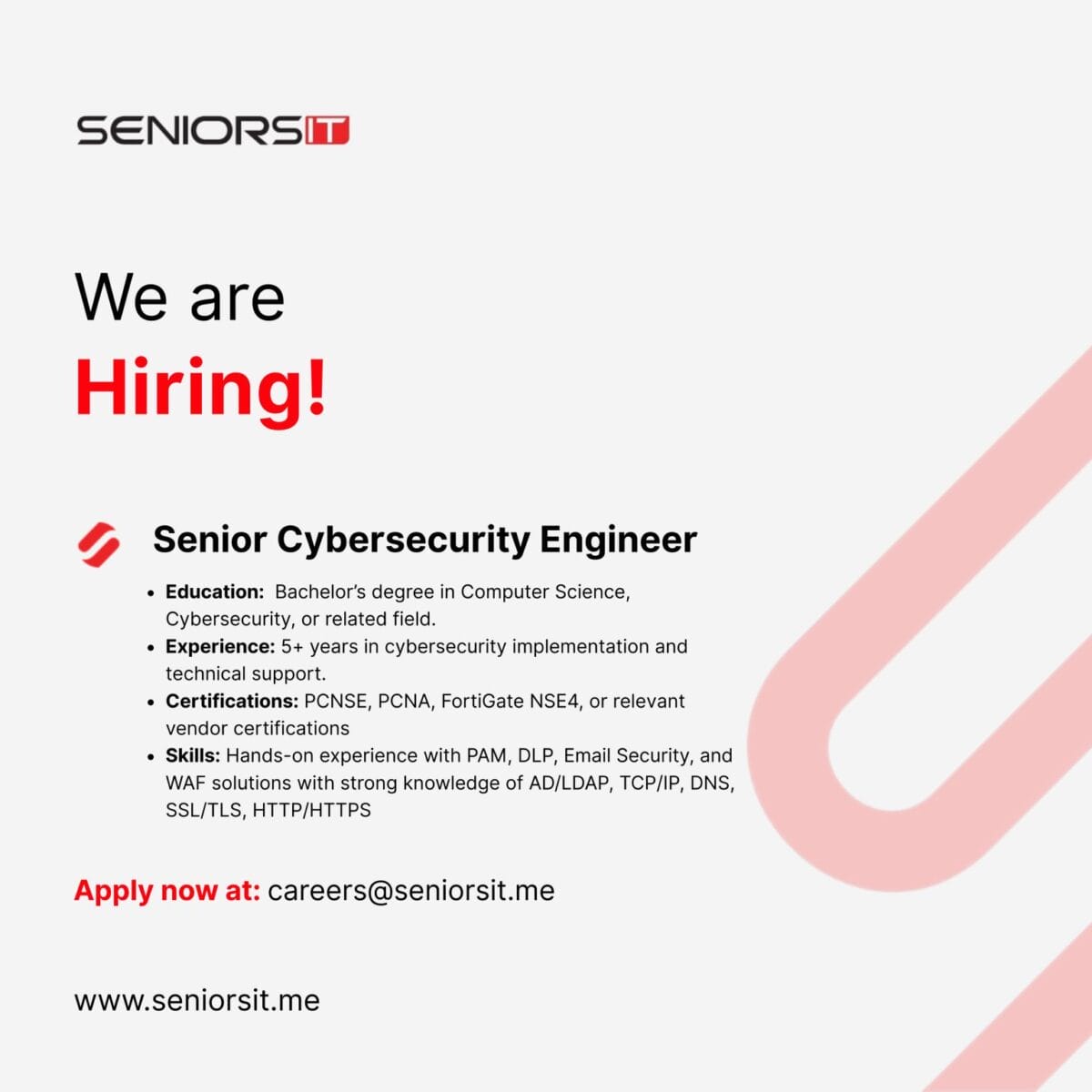 تبحث شركة Seniors IT عن مهندس أمن سيبراني أول للانضمام إلى فريقها المتخصص في الأردن. إذا كنت تمتلك خبرة عملية قوية في تطبيق ودعم حلول الأمن السيبراني وترغب بالعمل في بيئة احترافية ومتطورة، فهذه الفرصة مناسبة لك.