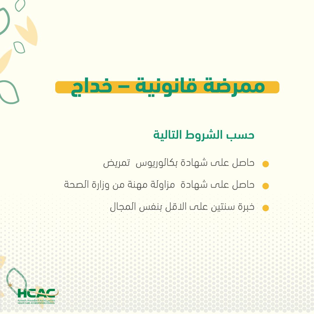 تندرج هذه الفرصة ضمن وظائف التمريض في المستشفيات، وتحديدًا وظائف ممرضة قانونية تخصص خداج، وهي مناسبة للباحثين عن وظائف طبية مستقرة وفرص عمل في القطاع الصحي.