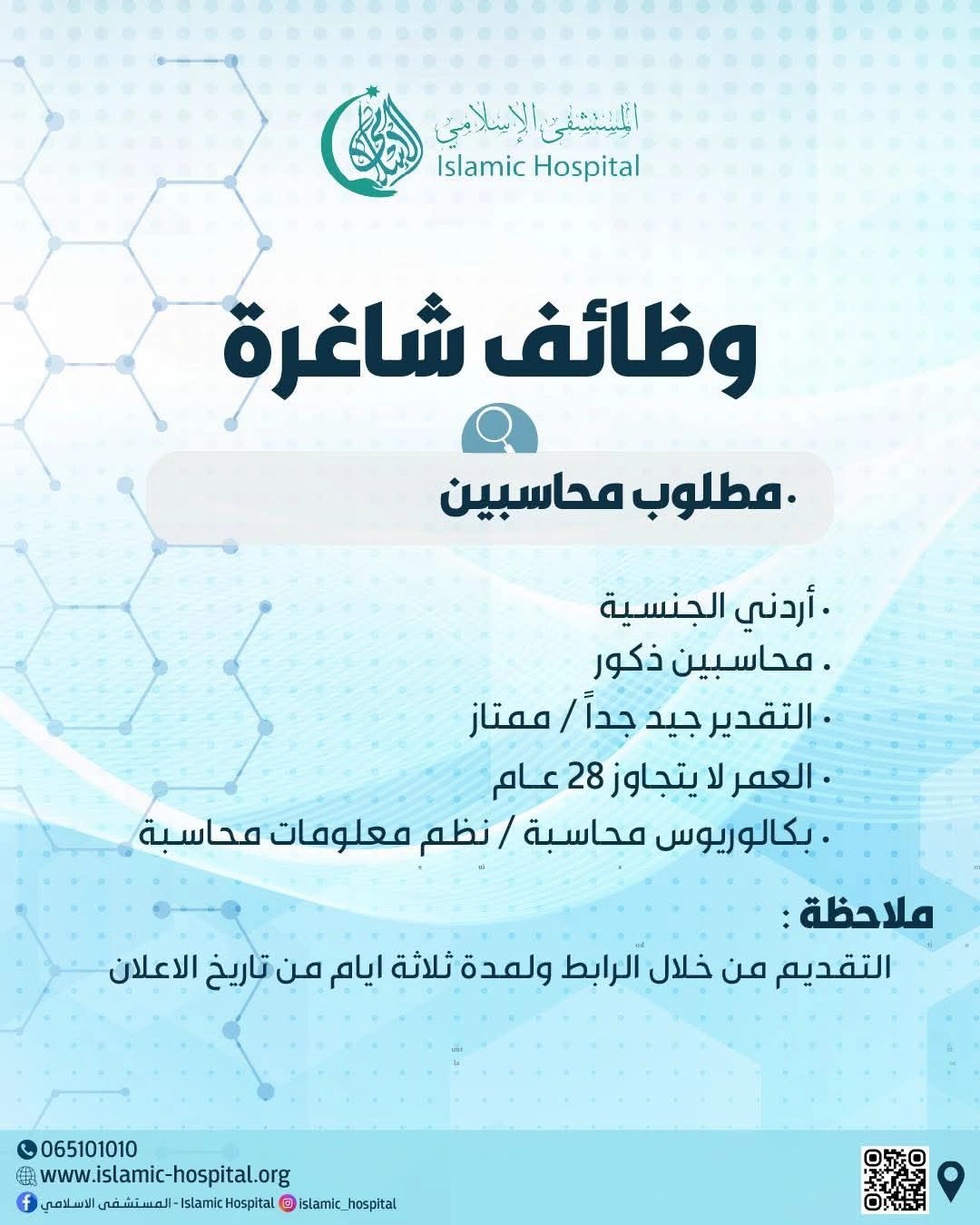 يعلن المستشفى الإسلامي عن توفر وظائف شاغرة لمحاسبين ضمن بيئة عمل احترافية ومستقرة، مع فرص حقيقية للتطور الوظيفي.