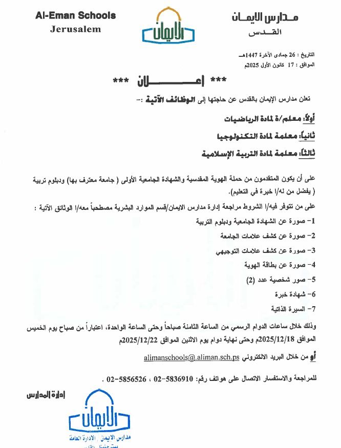 تعلن مدارس الإيمان – القدس عن حاجتها لتعيين معلمين ومعلمات للعام الدراسي القادم، وذلك ضمن بيئة تعليمية ملتزمة بالقيم الأكاديمية والتربوية، وتسعى للتميّز وبناء جيل واعٍ ومبدع.