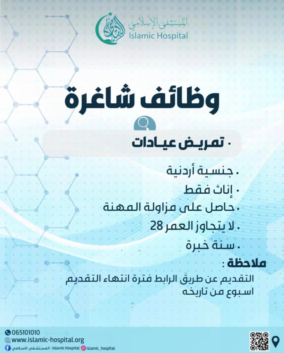 يعلن المستشفى الإسلامي عن رغبته في تعيين ممرضات للعمل في العيادات، ضمن بيئة طبية احترافية ومعتمدة، تركز على جودة الرعاية الصحية وسلامة المرضى.