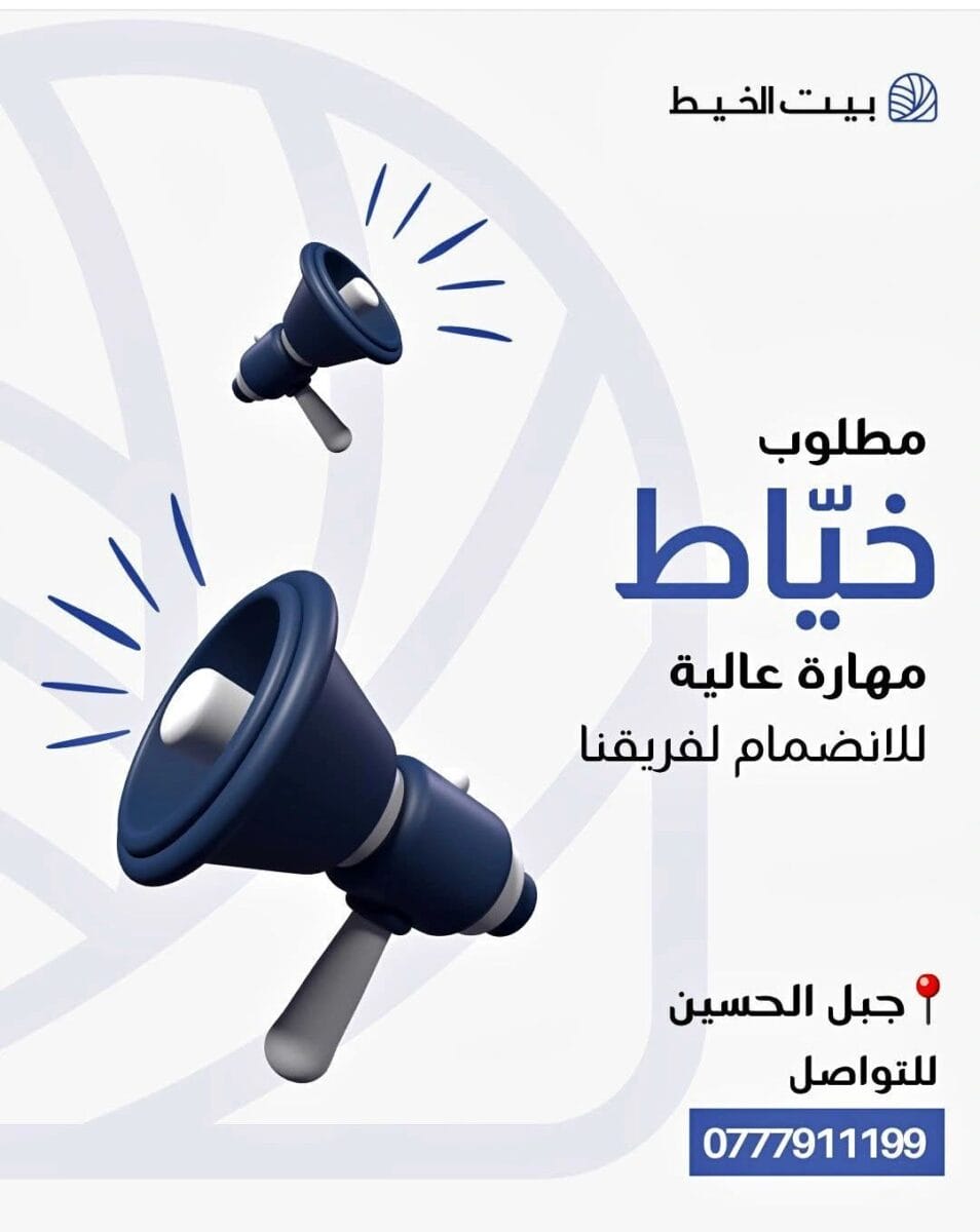 يعلن بيت الخيط عن حاجته إلى خياط محترف يتمتع بالدقة والسرعة وجودة التنفيذ، للانضمام إلى فريق العمل في موقعنا جبل الحسين. نبحث عن شخص لديه شغف بالخياطة والالتزام بالمواعيد والعمل بروح الفريق.