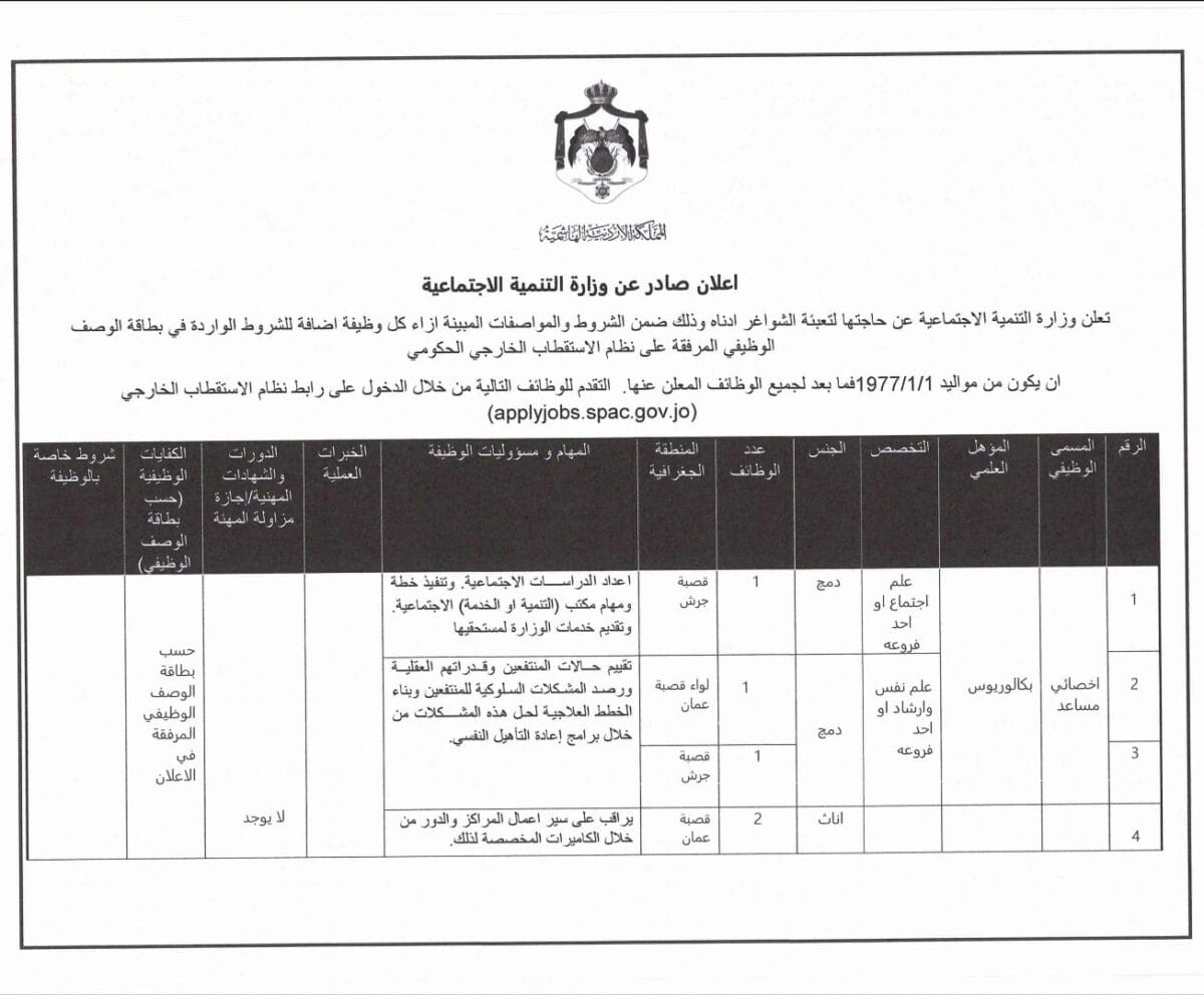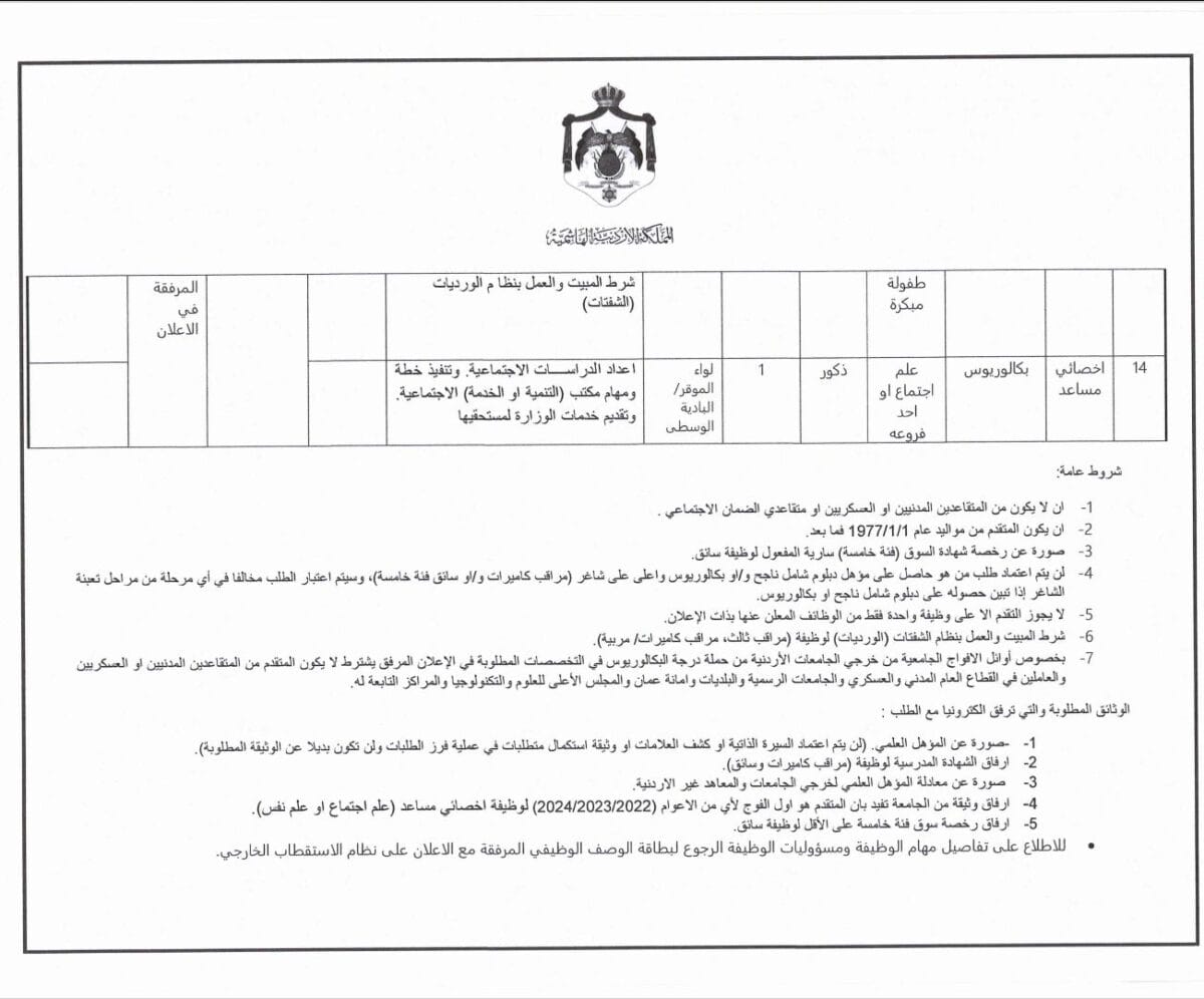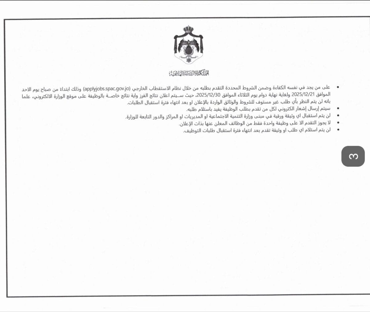 أعلنت وزارة التنمية الاجتماعية الأردنية عن فتح باب التقديم لعدد من الوظائف الحكومية الشاغرة في عدة تخصصات ومناطق داخل المملكة، وذلك ضمن نظام الاستقطاب الخارجي المعتمد رسميًا.