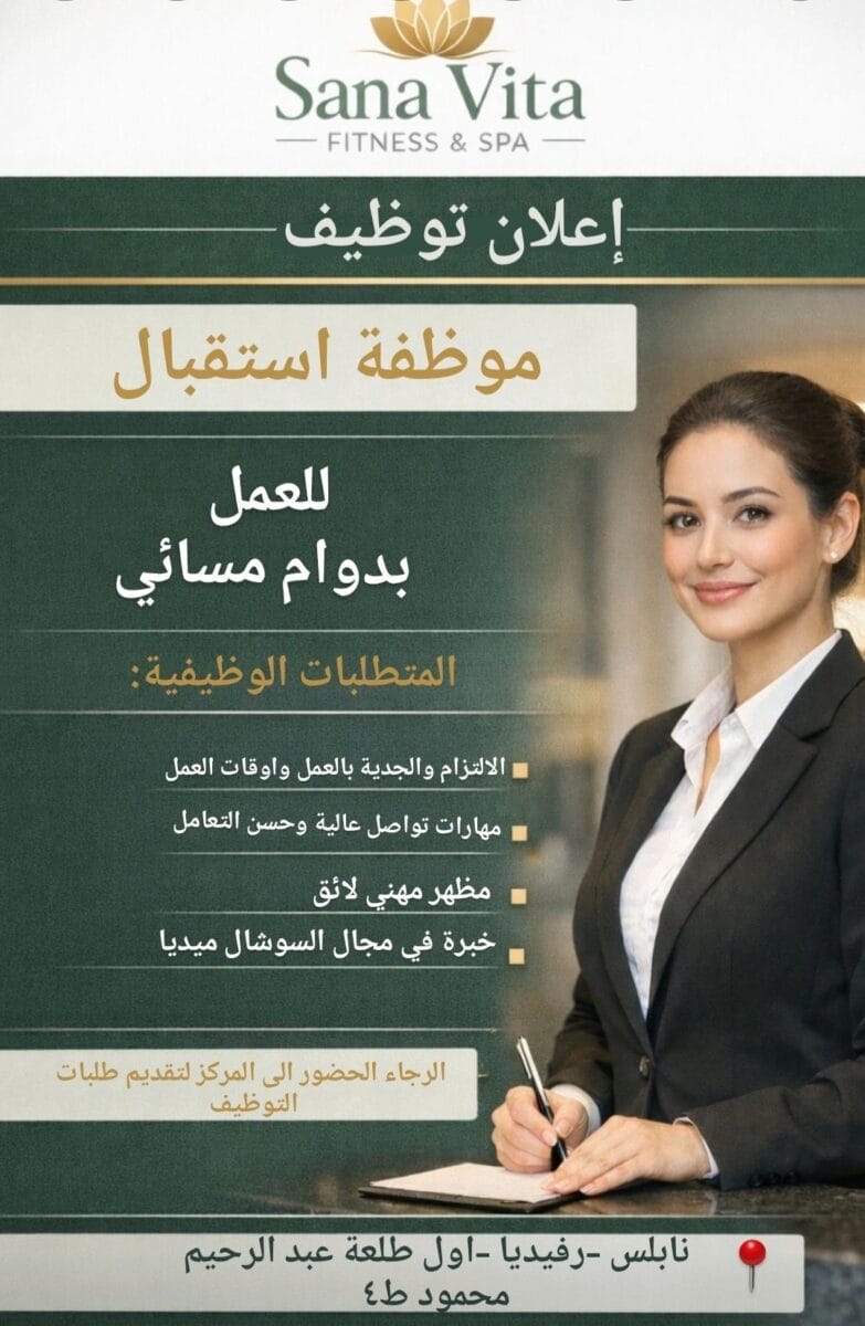 تعلن إدارة Sana Vita FITNESS & SPA – نابلس عن رغبتها في تعيين موظفة استقبال (Receptionist) للعمل بدوام مسائي ضمن فريق المركز.
