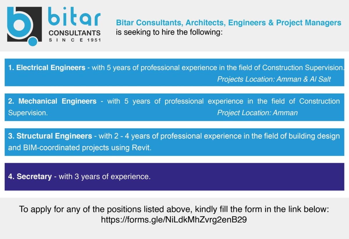 فرص عمل مهندسين وسكرتير في Bitar Consultants – عمّان والسلط