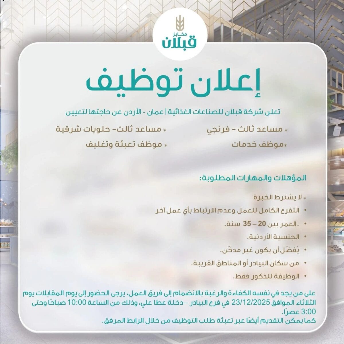 تُعلن شركة قبّلان للصناعات الغذائية – عمّان / الأردن عن فتح باب التوظيف الفوري لعدة شواغر ضمن بيئة عمل مستقرة وفرص مناسبة للباحثين عن عمل بدون اشتراط خبرة مسبقة.