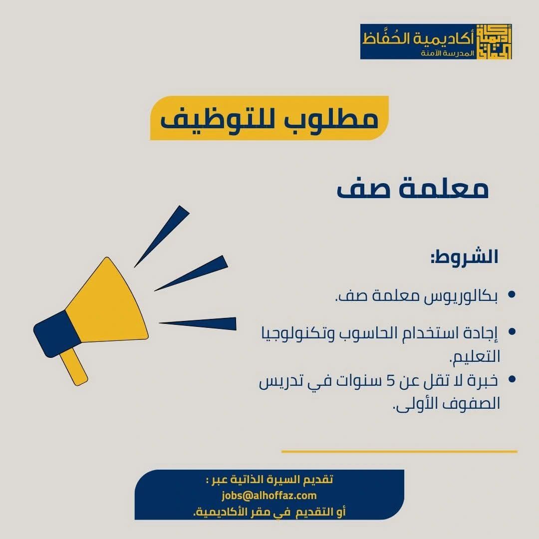 تعلن أكاديمية الحفاظ – المدرسة الآمنة عن حاجتها إلى معلمة صف مؤهلة للانضمام إلى كادرها التعليمي، ضمن بيئة تربوية داعمة تركز على جودة التعليم وبناء جيل متميز.