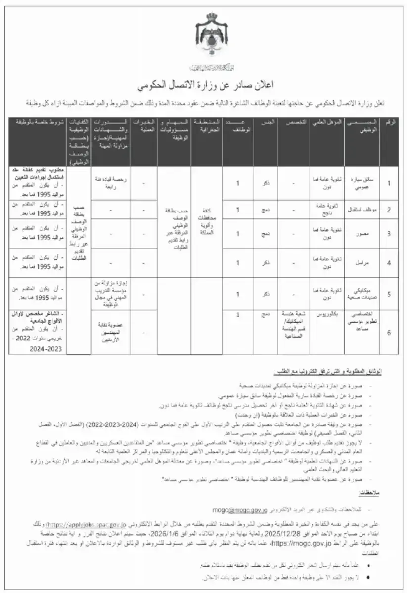 أعلنت وزارة الاتصال الحكومي عن توفر وظائف شاغرة بعقود محددة المدة ضمن شروط واضحة ومنافسة، في عدد من التخصصات الإدارية والفنية والهندسية، مع فرص حقيقية للعمل في قطاع حكومي مستقر.