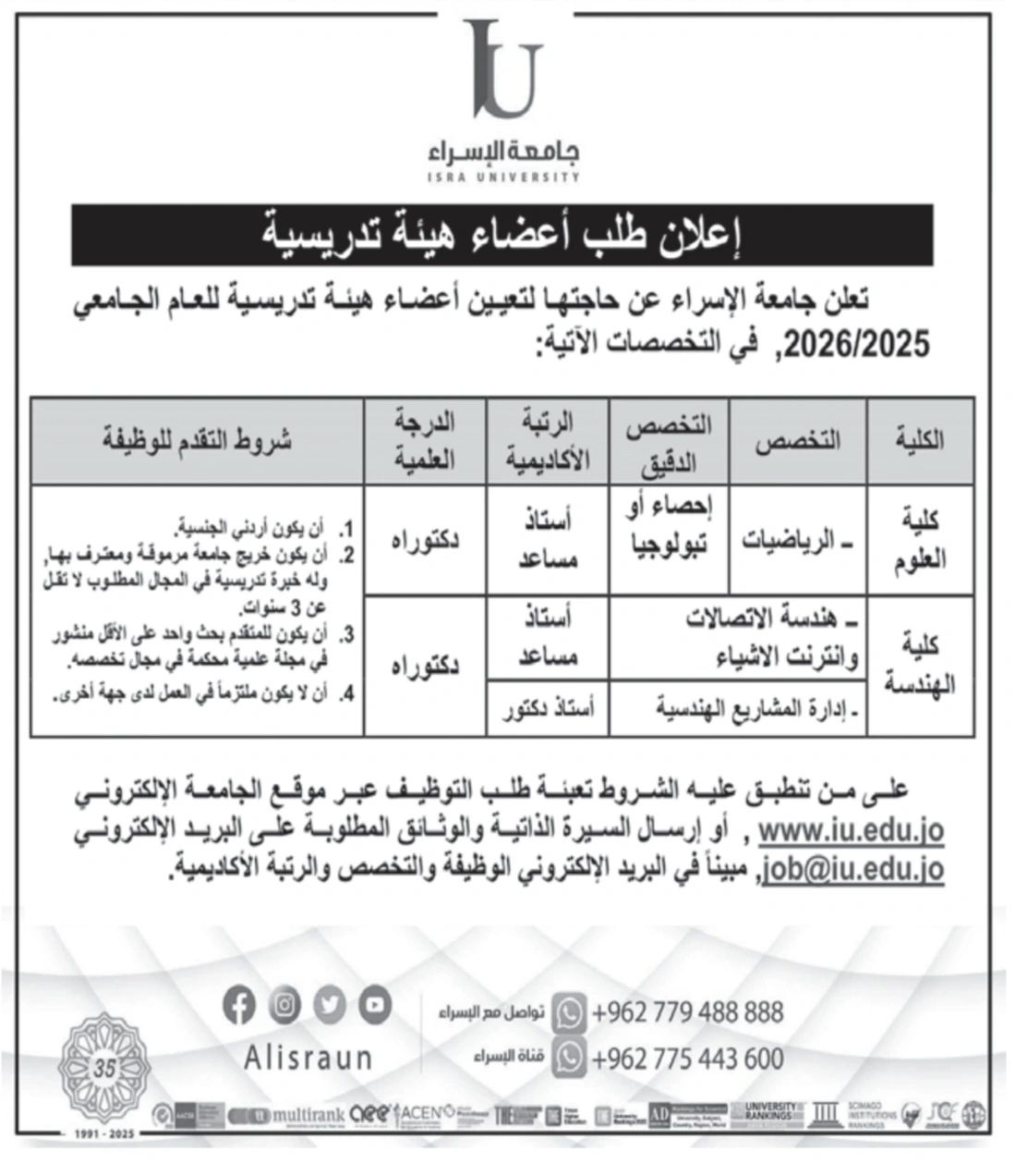 🎓 فرص أكاديمية مميزة – جامعة الإسراء تعلن عن وظائف هيئة تدريسية