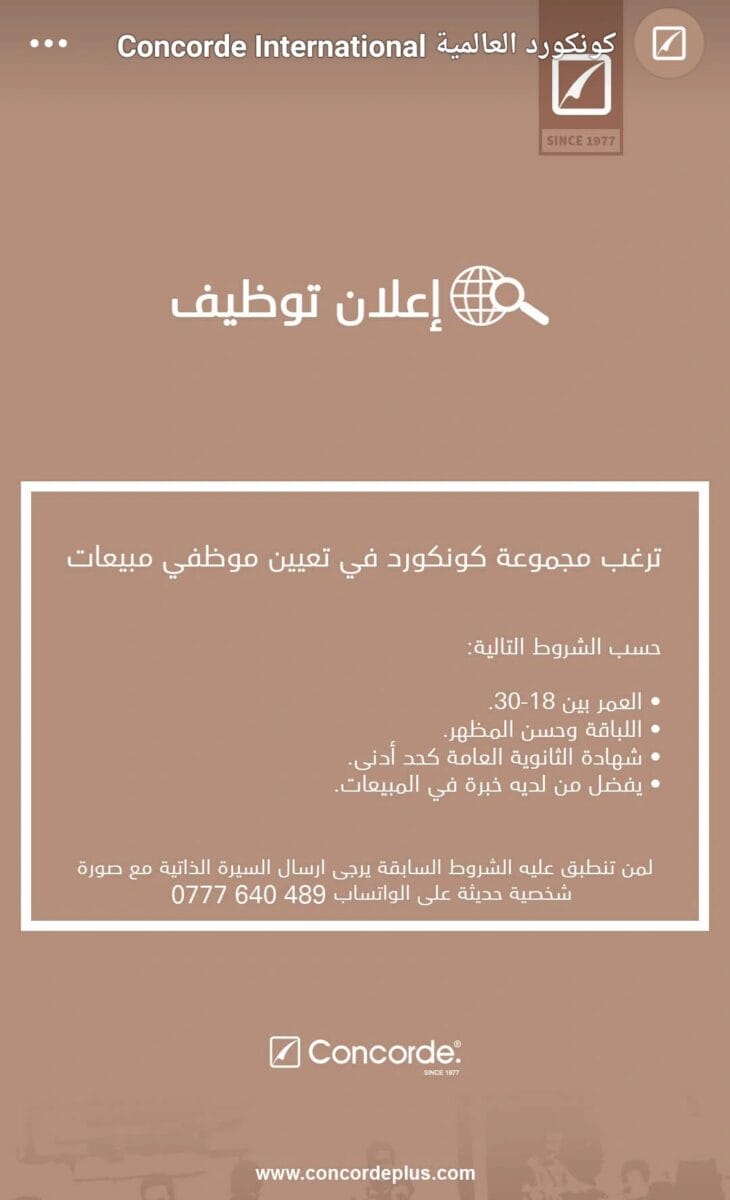 كونكورد العالمية تعلن عن توفر شواغر موظفي مبيعات بفرص فورية للتقديم والانضمام.