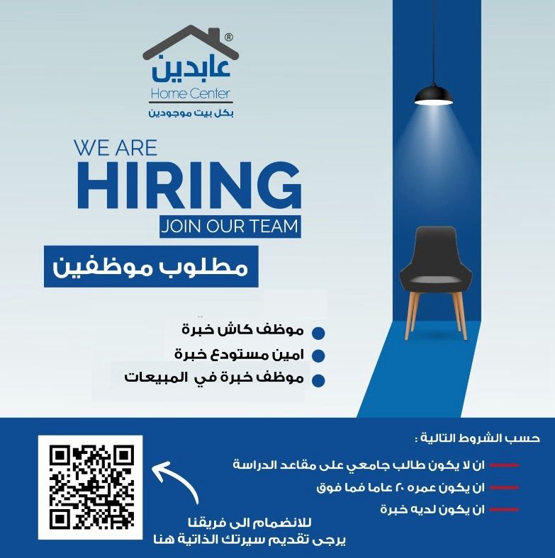 يعلن عابدين هوم سنتر (Abdeen Home Center) عن توفر فرص توظيف فورية للانضمام إلى فريقه، ضمن بيئة عمل احترافية تدعم التطور والاستمرارية.