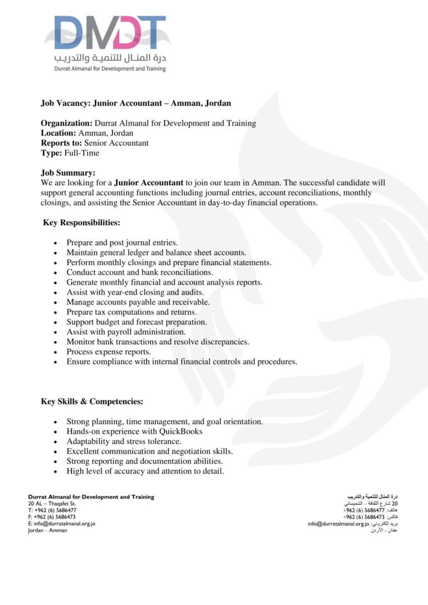 تعلن درة المنال للتنمية والتدريب (DMDT) عن حاجتها إلى محاسب Junior بدوام كامل للانضمام إلى فريقها المالي في عمّان.
