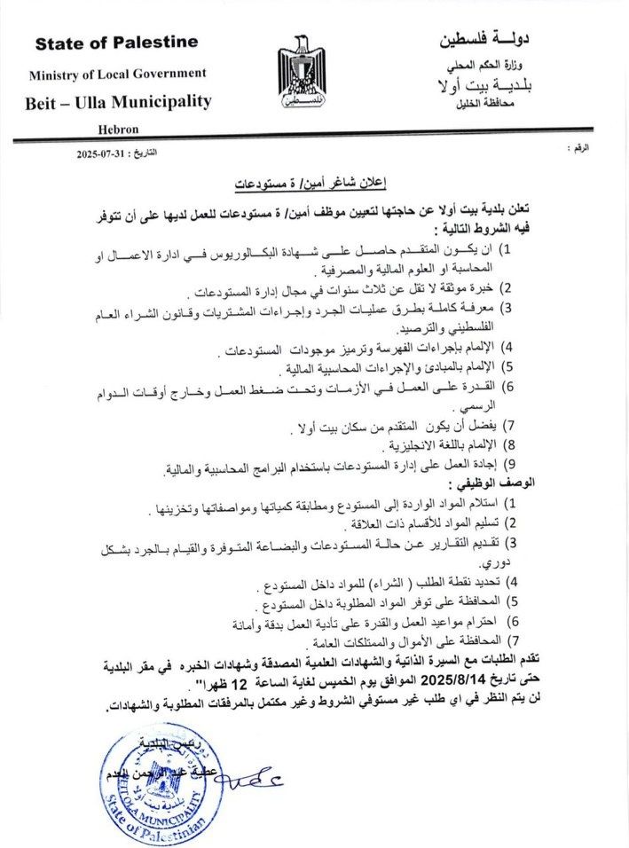 تعلن بلدية بيت أولا عن حاجتها لتعيين موظف/ـة أمين مستودع للعمل ضمن كادرها في مدينة الخليل.