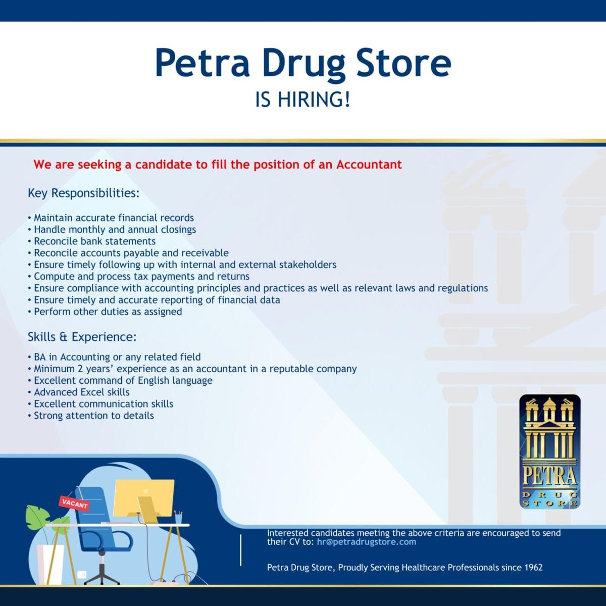 تعلن Petra Drug Store عن حاجتها إلى محاسب مؤهل وذو خبرة للانضمام إلى فريقها المالي، ضمن بيئة عمل احترافية ومستقرة في قطاع الرعاية الصحية.
