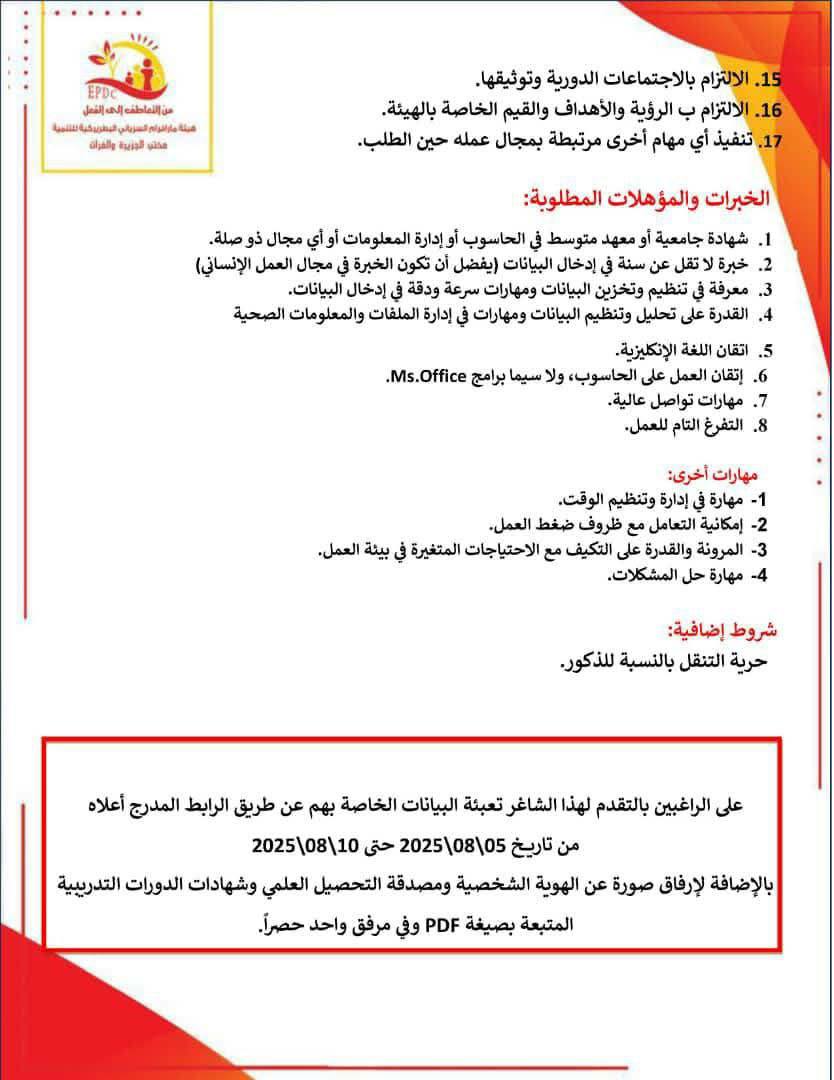 ✅ مهارات سرعة ودقة في الطباعة والتعامل مع قواعد البيانات.