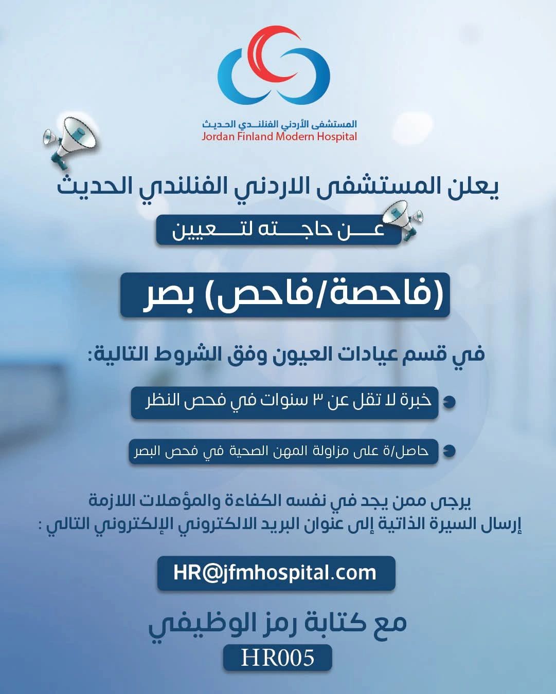يعلن المستشفى الأردني الفنلندي الحديث عن حاجته لتعيين فاحصة/فاحص بصر وفق الشروط التالية:
