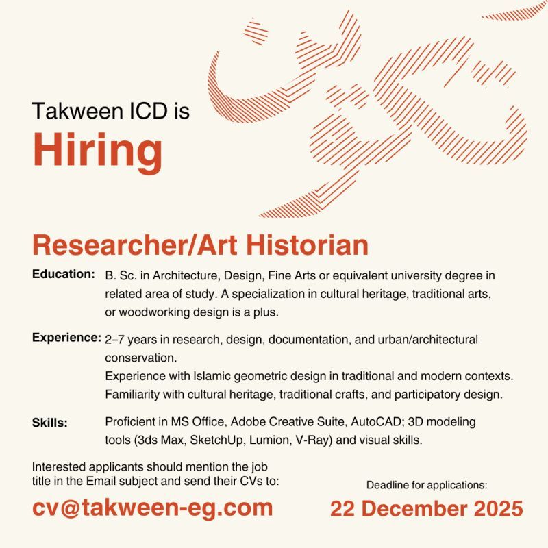 تُعلن Takween ICD عن حاجتها إلى باحث / مؤرخ فني (Researcher / Art Historian) للانضمام إلى فريقها المتخصص في التصميم الثقافي والحفاظ العمراني.