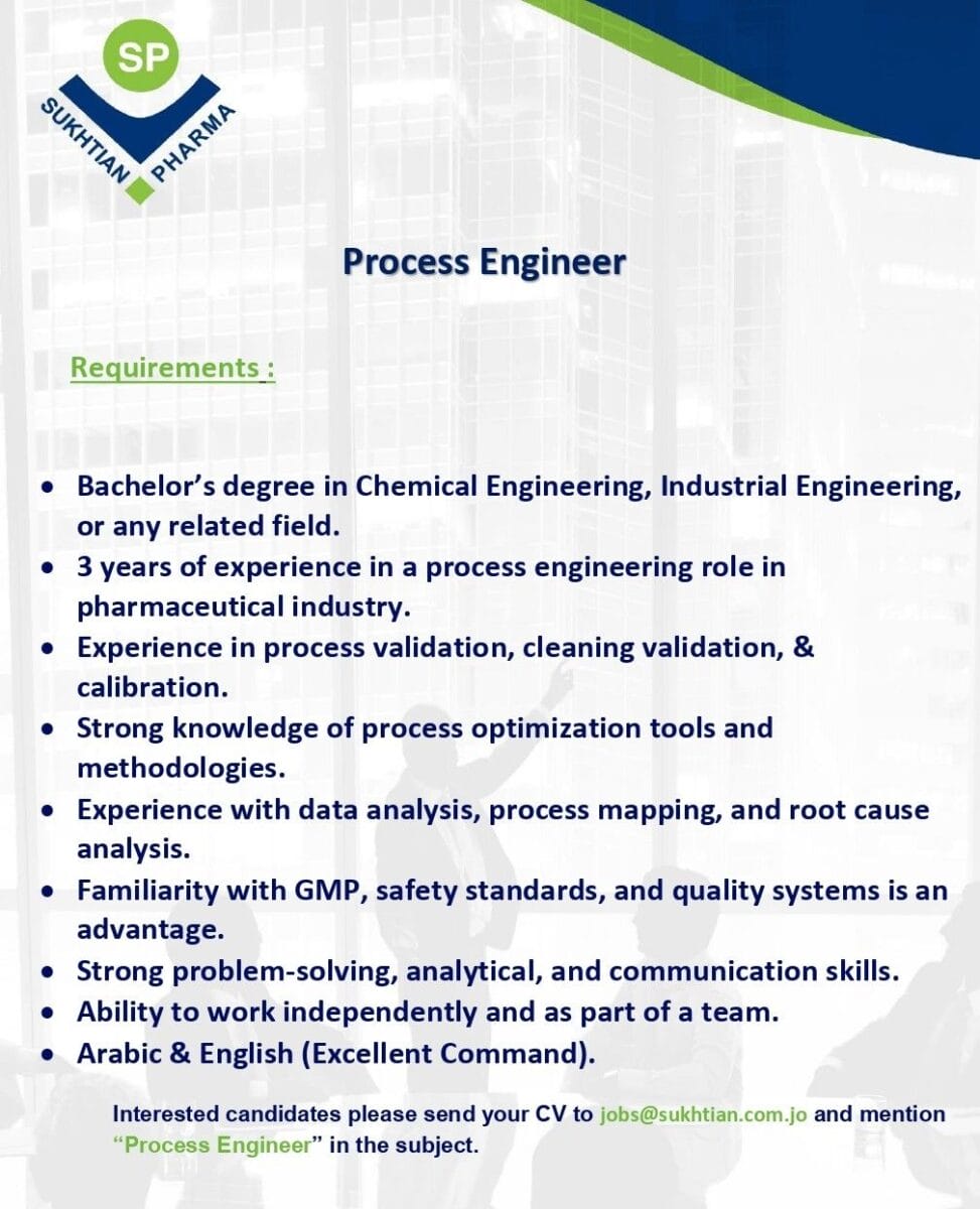 هل تبحث عن فرصة مثيرة للعمل في صناعة الأدوية؟ نحن في شركة Sukhtian Pharma نبحث عن مهندس عمليات ذو خبرة للانضمام إلى فريقنا. إذا كنت تمتلك درجة بكالوريوس في الهندسة الكيميائية أو الهندسة الصناعية، ولديك ثلاث سنوات من الخبرة في مجال الهندسة العملية في صناعة الأدوية، فنحن نريدك!
