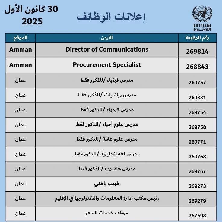 الأردن: مدير اتصالات، متخصص مشتريات، مدرسين (رياضيات، كيمياء، فيزياء، علوم عامة، لغة إنجليزية).
