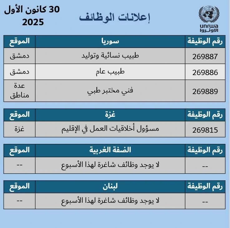 أعلنت الأونروا عن وظائف شاغرة لعام 2026 في عدة دول تشمل الأردن، سوريا، لبنان، وغزة. إذا كنت تمتلك المهارات المطلوبة وترغب في العمل في بيئة دولية مهنية، فإن هذه الفرصة هي لك!