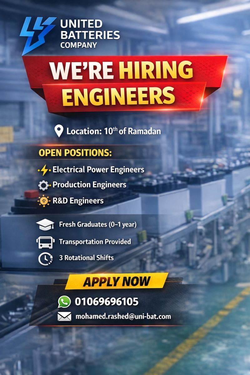 United Batteries Company تعلن عن فتح باب التوظيف الفوري لمجموعة من التخصصات الهندسية للعمل في مصنعها بالعاشر من رمضان.
