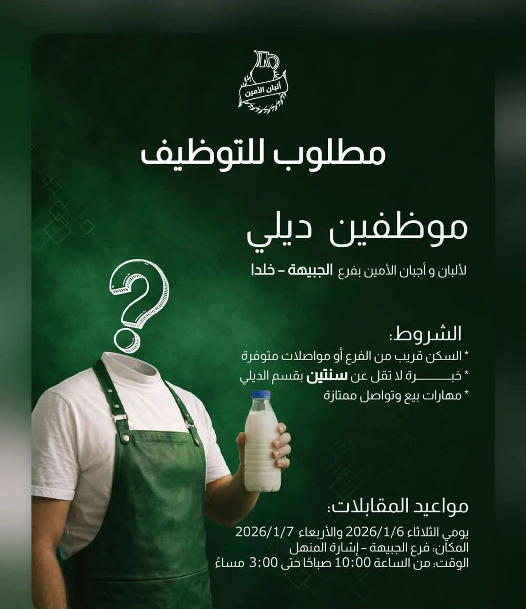 فرصة توظيف مباشرة في ألبان وأجبان الأمين – فرع الجبيهة / خلدا