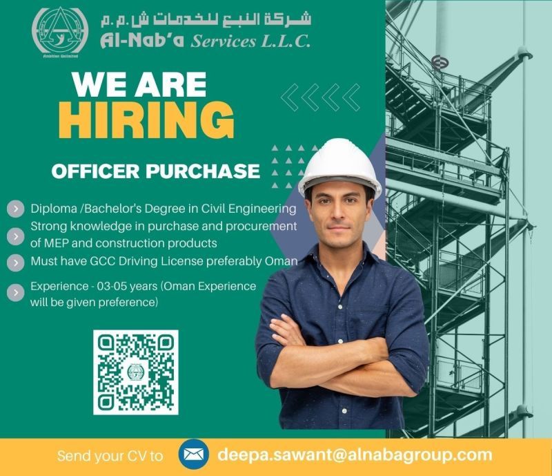 تعلن شركة النبع للخدمات (Al-Nab’a Services L.L.C.) عن حاجتها إلى موظف مشتريات (Purchase Officer) للعمل ضمن مشاريع إنشائية ومقاولات كبرى في سلطنة عُمان.