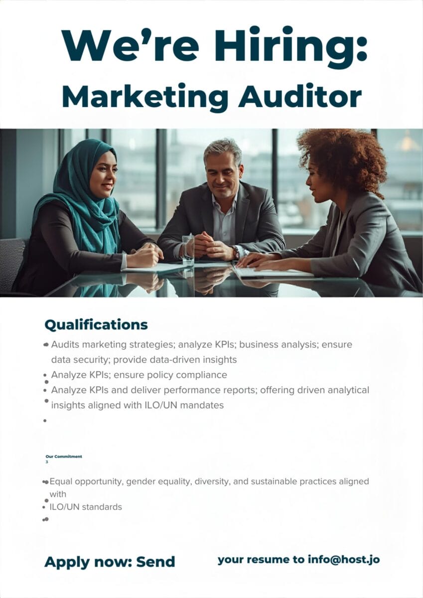 تعلن Jordan Host عن حاجتها لتوظيف Marketing Auditor للانضمام إلى فريقها في عمّان – العمل في الموقع، بهدف تقييم الحملات التسويقية وضمان الامتثال وتحسين الأداء.