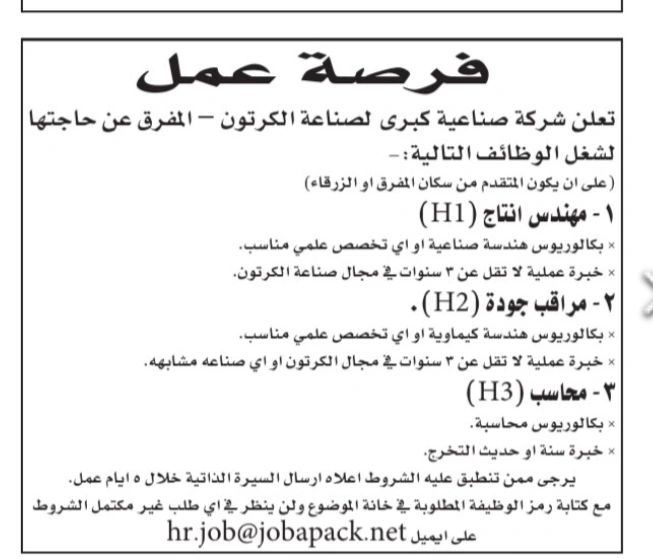 خبرة لا تقل عن 3 سنوات في مجال صناعة الكرتون أو الصناعات المماثلة.