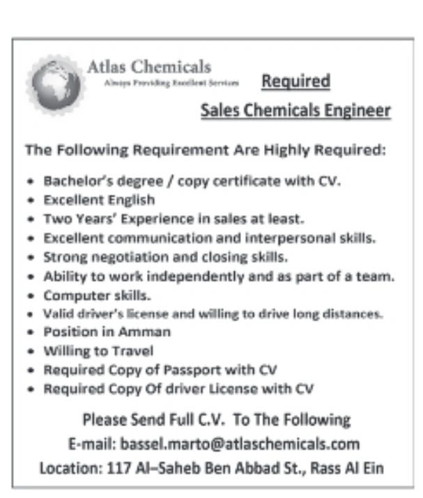 مطلوب مهندس مبيعات كيميائيات للعمل فورًا في شركة Atlas Chemicals