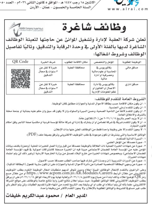 تُعلن شركة العقبة لإدارة وتشغيل الموانئ عن حاجتها لتعيين مدقق مالي ومدقق إداري للعمل ضمن وحدة الرقابة والتدقيق، ضمن بيئة مهنية مستقرة وفرص تطوير حقيقية.