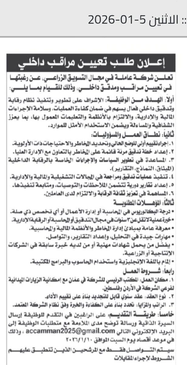 تُعد وظيفة مراقب داخلي من أهم وظائف التدقيق في الأردن، خاصة في الشركات العاملة في القطاع الزراعي، لما لها من دور أساسي في تعزيز الرقابة وتحسين الأداء المالي والإداري.