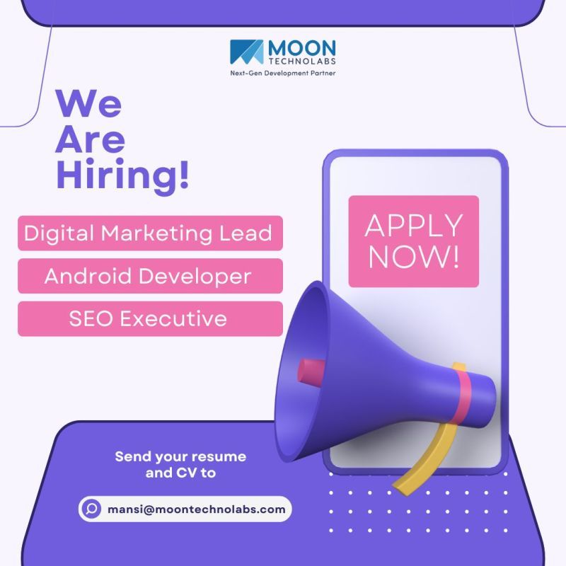 تعلن Moon Technolabs عن فتح باب التوظيف لعدد من الوظائف المميزة ضمن فريقها المتخصص في التكنولوجيا، التسويق الرقمي، وتطوير البرمجيات.