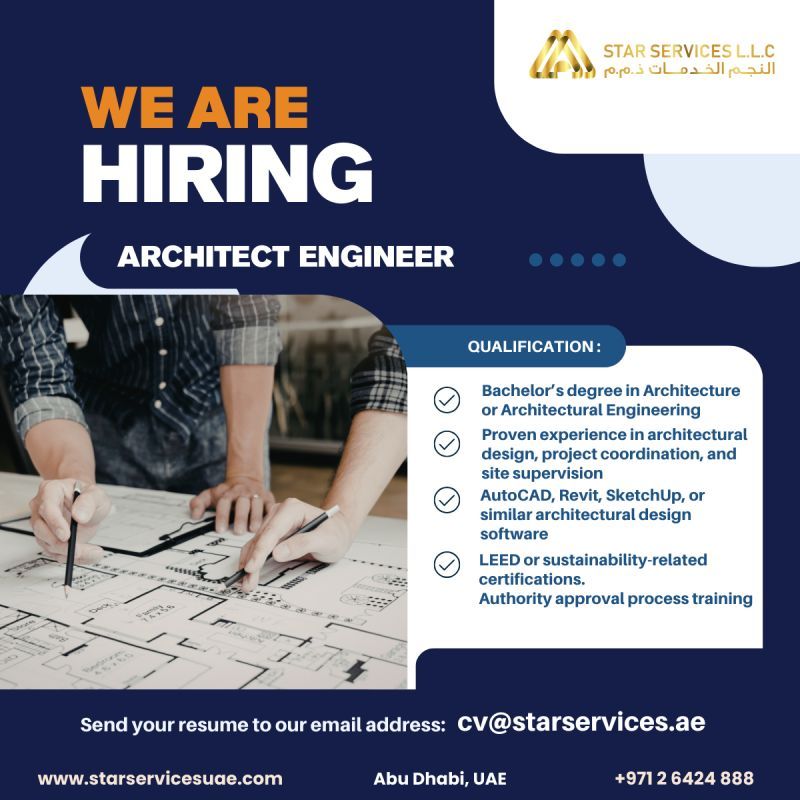 تعلن شركة Star Services L.L.C عن حاجتها إلى Architect Engineer للعمل في أبوظبي ضمن فريق هندسي محترف يشارك في مشاريع معمارية مميزة.