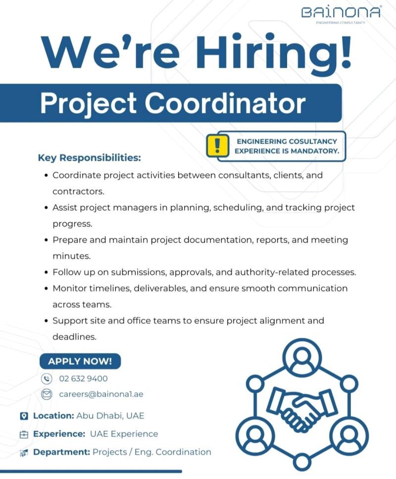 شركة Bainona للاستشارات الهندسية تعلن عن فتح باب التوظيف لوظيفة منسق مشروع في أبوظبي، الإمارات العربية المتحدة. إذا كنت تتمتع بخبرة استشارية في الهندسة، هذه فرصتك الآن!