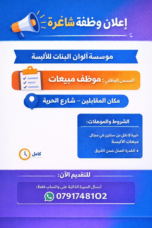 تُعد هذه الوظيفة فرصة مثالية لكل من يبحث عن وظائف مبيعات في عمان، خصوصًا في قطاع الألبسة والملابس الجاهزة. إذا كنت تبحث عن وظيفة موظف مبيعات بدوام كامل وبخبرة عملية حقيقية، فهذا الإعلان مناسب لك ويمنحك فرصة توظيف فوري.